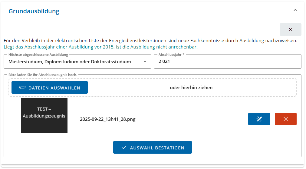 Im Feld Höchste abgeschlossene Ausbildung stehen Ihnen in einem DropDown-Menü verschiedene Optionen zur Auswahl. Geben Sie das Abschlussjahr der Höchsten abgeschlossenen Ausbildung an und laden Sie das zugehörige Abschlusszeugnis zum Nachweis als Datei hoch.