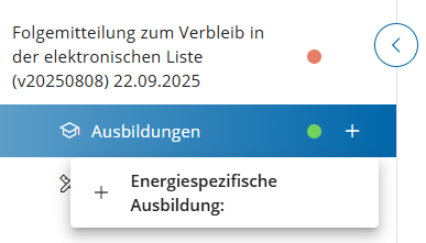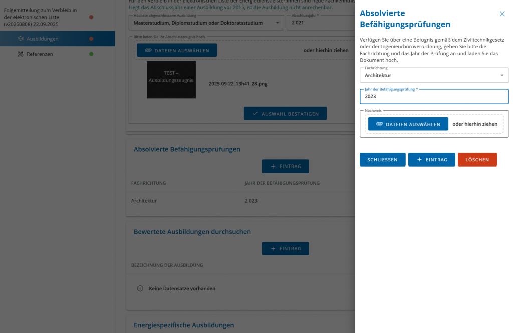 Wenn Sie über absolvierte Befähigungsprüfungen verfügen, die nach der Ersteintragung in die elektronische Liste absolviert wurden, klicken Sie unter Absolvierte Befähigungsprüfungen auf den Button +EINTRAG, um diese nachzuweisen. Rechtsseitig wird ein Eingabe-Bereich geöffnet. Hilfreiche Informationen zur Eingabe erhalten Sie mit Klick auf das Feld „i“.